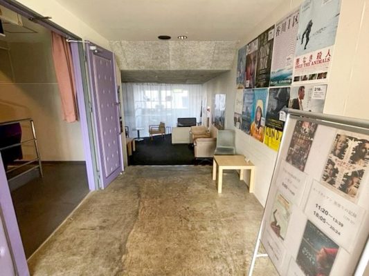 ところどころに見え隠れする段差のある床や階段。ここは3スクリーンあったうちのひとつ、上映スペースの名残を残しつつも、適度なリノベーションをかけている共有スペースです。